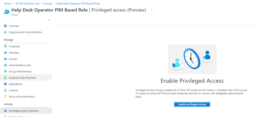 Back in PIM, if you click Privileged access groups (Preview) you’ll see that the role-assignable group is now visible.
