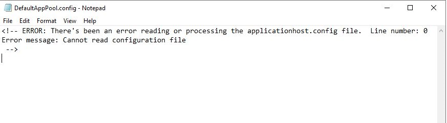 CONFIGURATION FILE IS NOT WELL-FORMED XML & the path c:\inetpub\temp\apppools\DefaultAppPool\DefaultAppPool.config