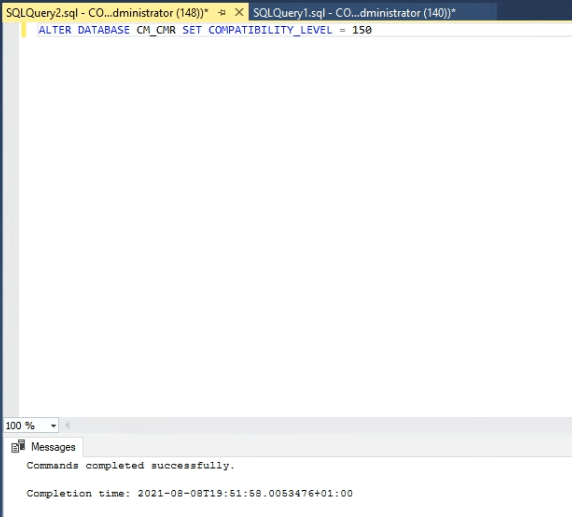 ALTER DATABASE <ConfigMgr database name> SET COMPATIBILITY_LEVEL = 150