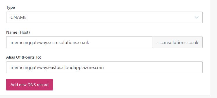 Now we need to map to the region your CMG will be deployed to plus cloudapp.azure.com. You’ll be given some details on this when you run through the CMG wizard, but as an example I will need to map – memcmggateway.sccmsolutions.co.uk to memcmggateway.eastus.cloudapp.azure.com with my external DNS provider as a CNAME record.