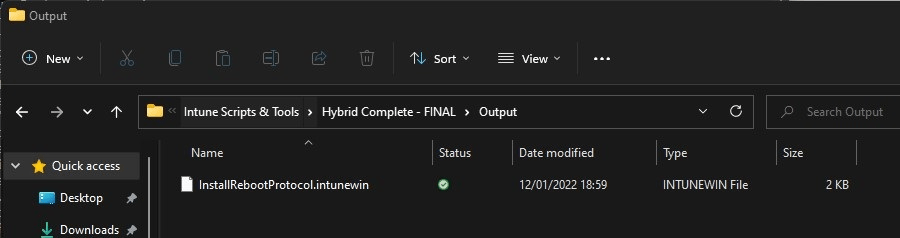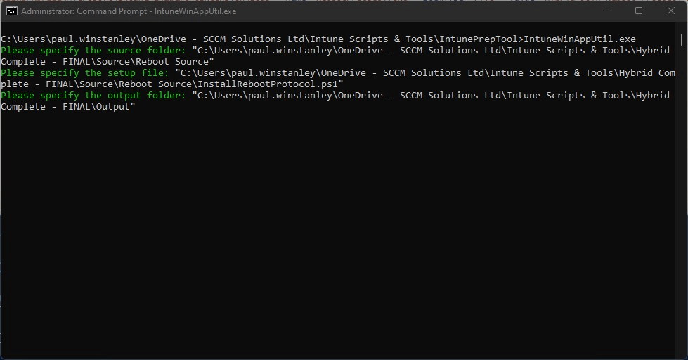 As you can see, I have put the InstallRebootProtocol.ps1 file into it’s own Source folder. I can now run the Win32 Content Prep tool to create the .intunewin file.