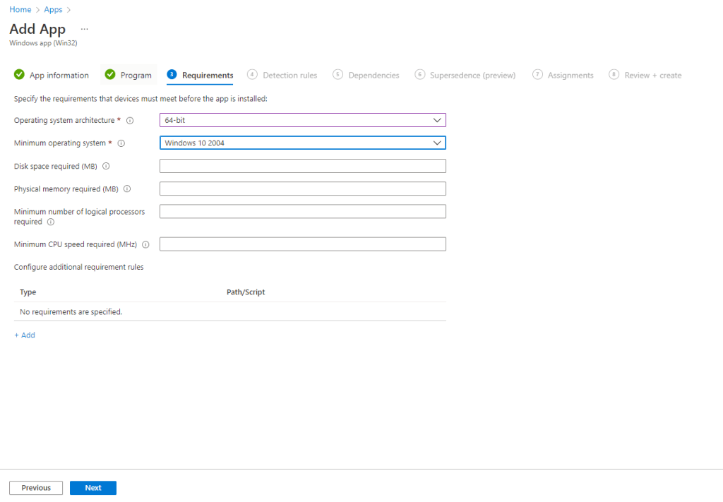 At the Requirements screen, enter architecture and minimum operating system release. The scripts have been tested on 20H2. Click Next.