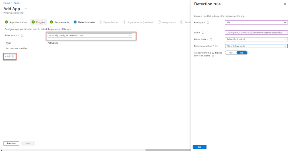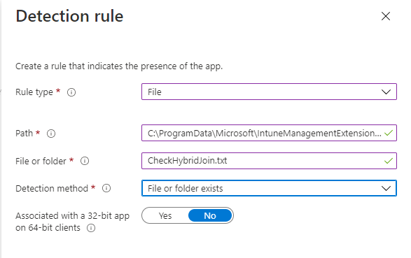 For the detection method we will follow the same logic as the reboot protocol script but this time the File or folder to check for is called CheckHybridJoin.txt.