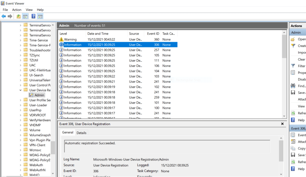 <Subscription><QueryList><Query Id="0" Path="Microsoft-Windows-User Device Registration/Admin"><Select Path="Microsoft-Windows-User Device Registration/Admin">*[System[EventID=306]]</Select></Query></QueryList></Subscription>
