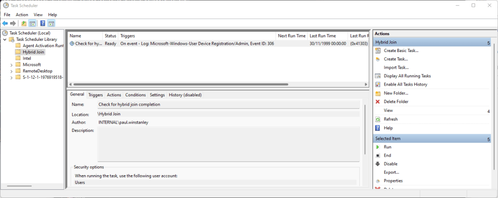 - Create the scheduled task called Check for hybrid join completion in a folder called Hybrid Join in the Scheduled Task app.