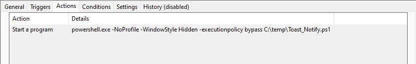 When triggered the scheduled task is going to run the toast_notify PowerShell script.