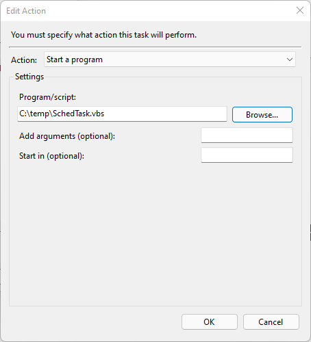 As mentioned, you may wish to suppress a flashing blue window which appears when executing the PS1 file from the scheduled task. To do this, include the SchedTask.vbs in your toast notification app and edit the scheduled task itself as such: