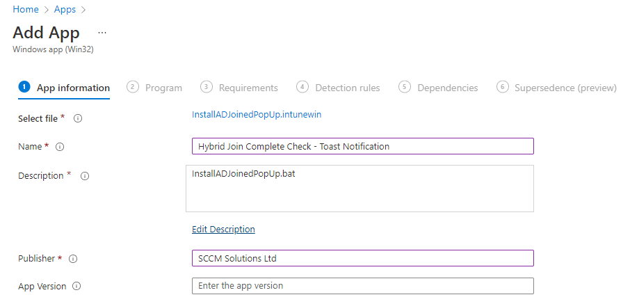 Note that I am using the InstallADJoinedPopUp.bat as my setup file for the Toast Notification Win32 app.