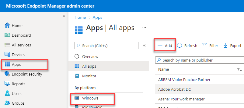 We will now create the app in the Endpoint Manager console, so head to https://endpoint.microsoft.com. Navigate to Apps\Windows and click Add.