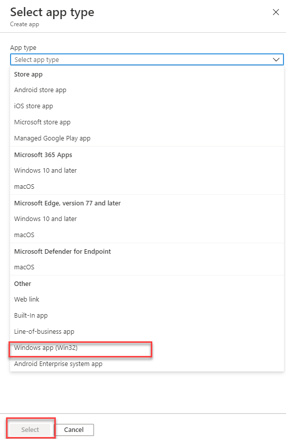From the App type drop down, choose Windows app (Win 32) and then choose Select when prompted.
