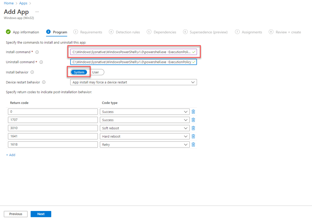 The Install command will be the InstallADJoinedPopUp.bat and I haven’t created an uninstall script so I’ve filled in with the same .bat file since this field is mandatory. Again, ensure Install behavior is set to System.