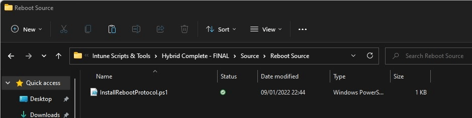 - Reboot.bat – this batch file is called when the Reboot button is pressed on the toast notification. You may remember that this was the value of our registry key entry in the Reboot Protocol Script.