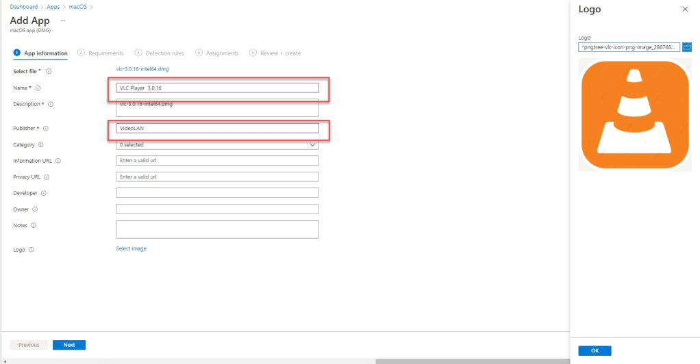At the App information screen, we need a minimum of Name and Publisher specified. I’ve also added a logo for the app. Click Next when done.