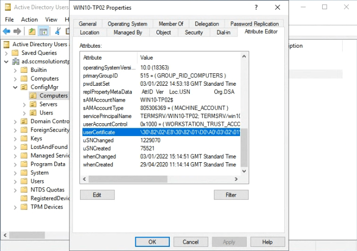 To kick start the process of fixing the devices, I needed to remove the userCertificate from the AD object.
