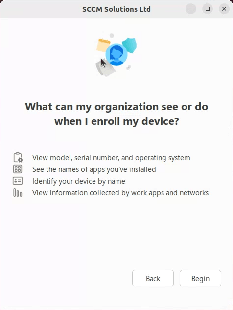 You will be informed of what the organization can see when the device is enrolled. Click Begin to continue.