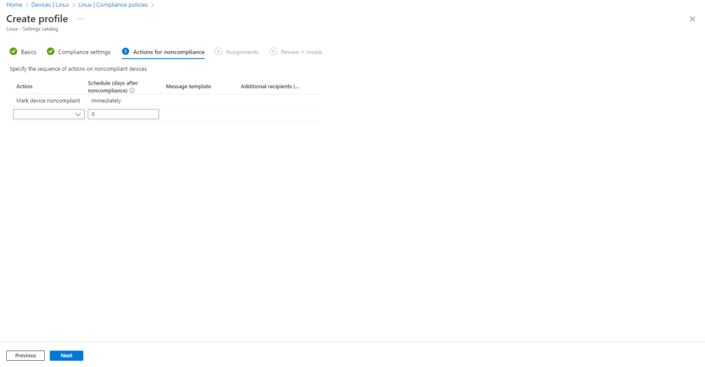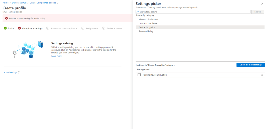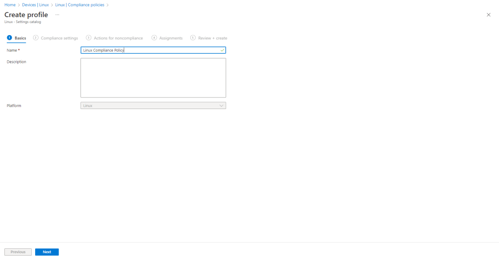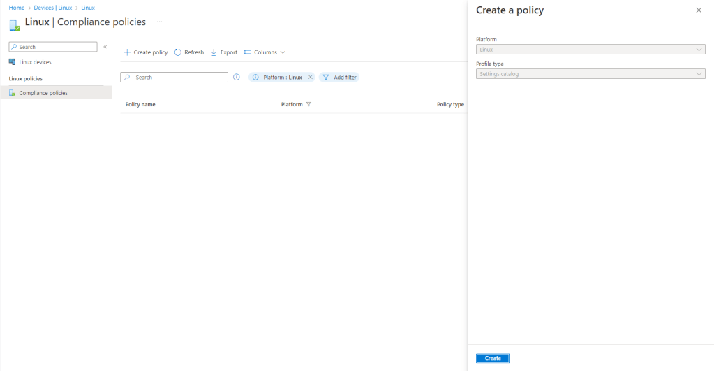 In the Endpoint Manager portal, navigate to Devices\Linux\Compliance policies. Click Create policy. The profile type will automatically be set to Settings catalog and the platform will be Linux. Click Create.