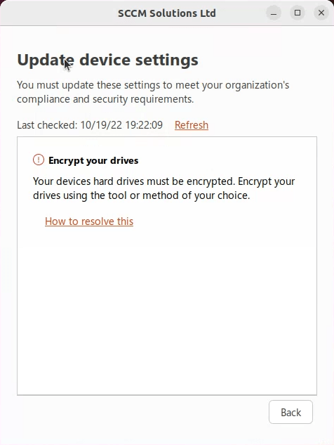 Refreshing the Intune app on the device shows that this is now marked as Not compliant.