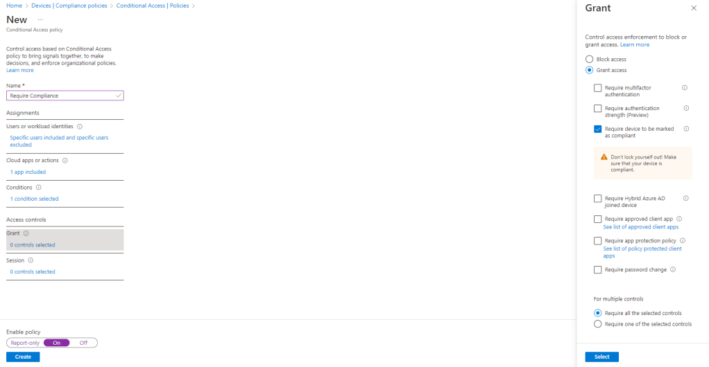and I can ensure that the device must be marked as compliant for me to be able to use the cloud app, in this case Office.