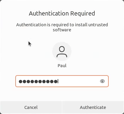 Authentication is required to install the software. Enter a password of an administrator and click Authenticate.