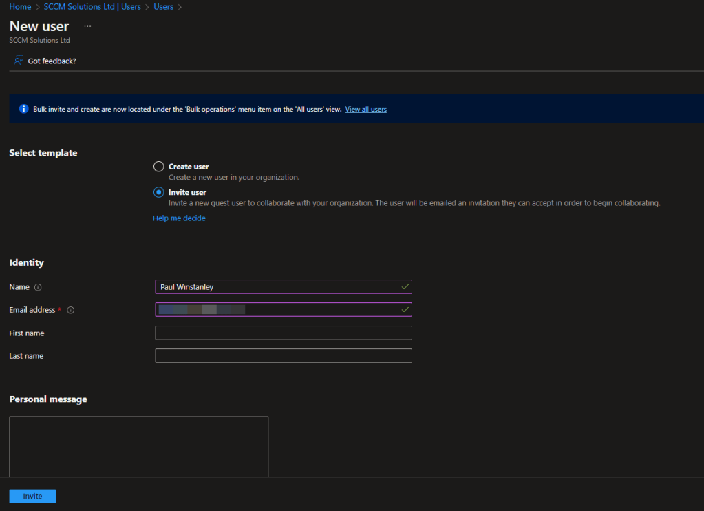 Under Identity, enter the Email address of the external user. Enter any other optional information. Click Invite. An email invitation is sent to the user at that email address and the user is added to the Azure AD.