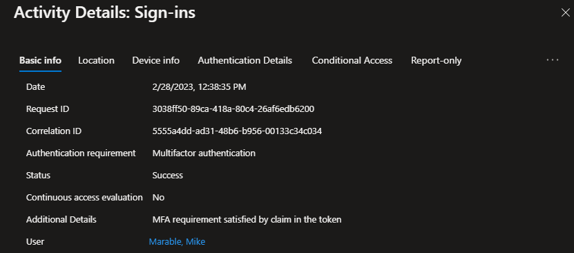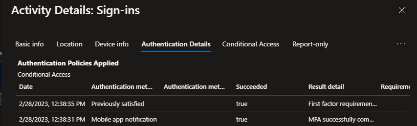 In Authentication Details, two events occur, Previously Satisfied has occurred with First factor requirement as the result. Mobile app notification is recorded with MFA successfully completed being the result.
