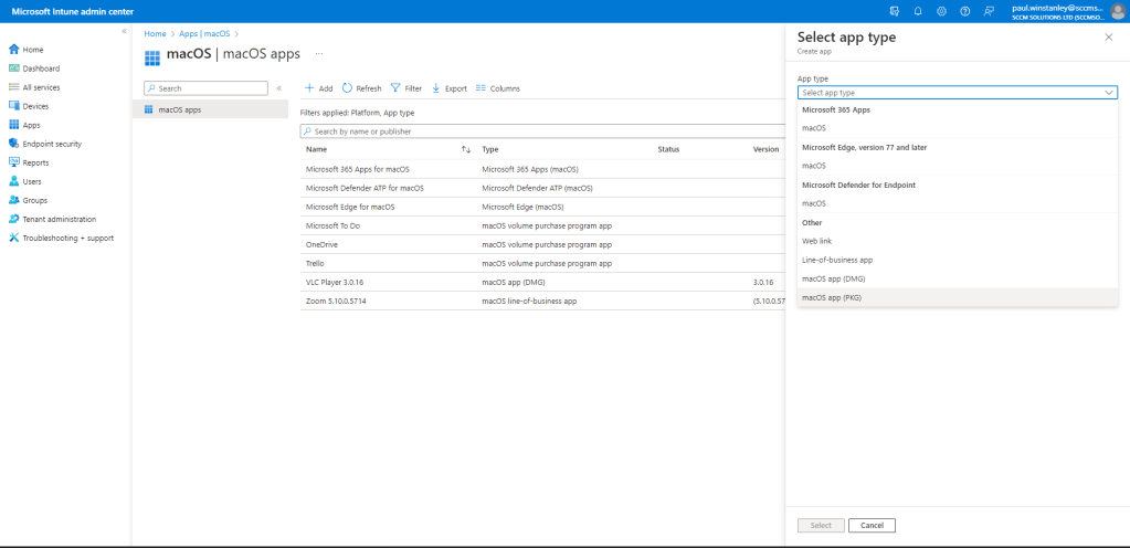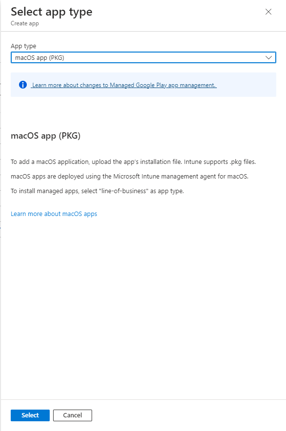 Navigate to the Select app type pane, and within the Other app types section, opt for the macOS app (PKG) option.