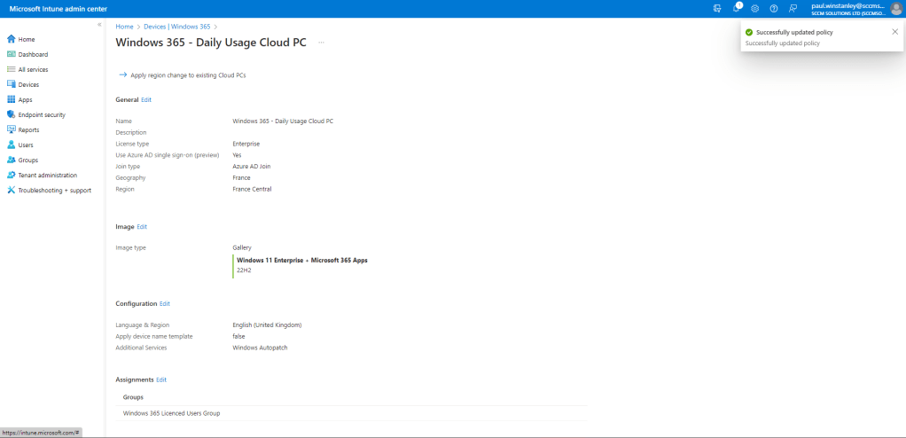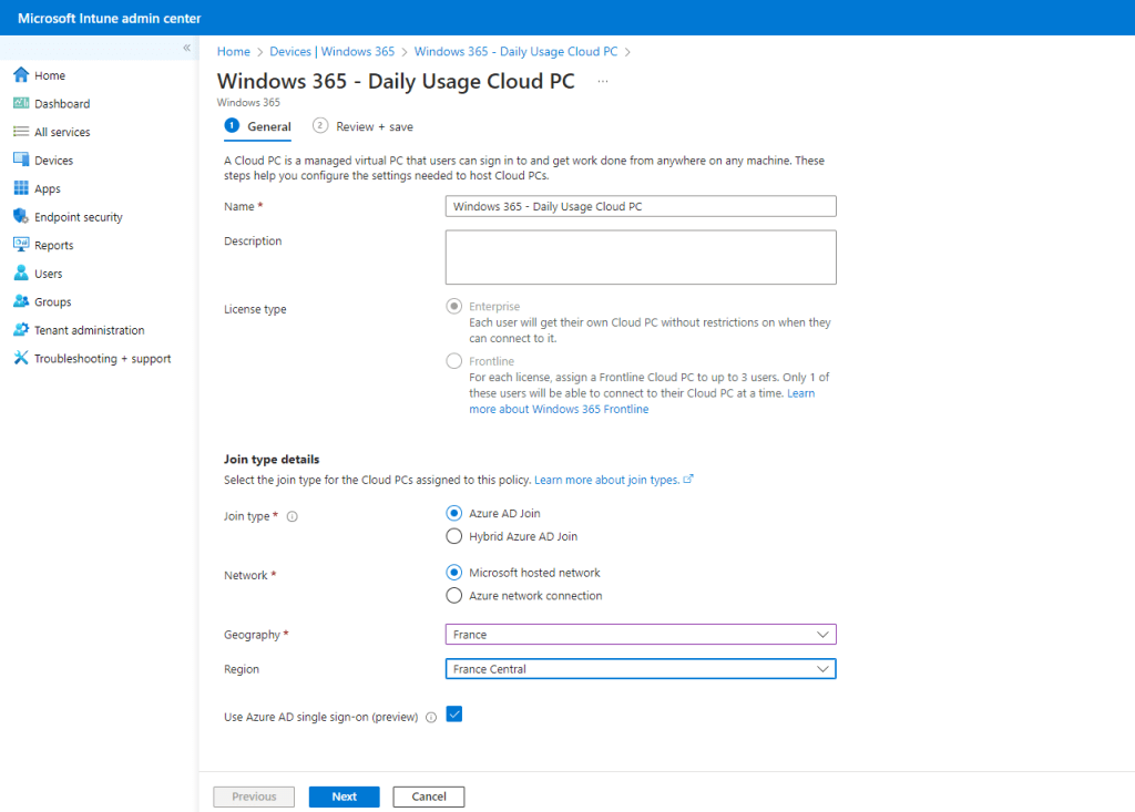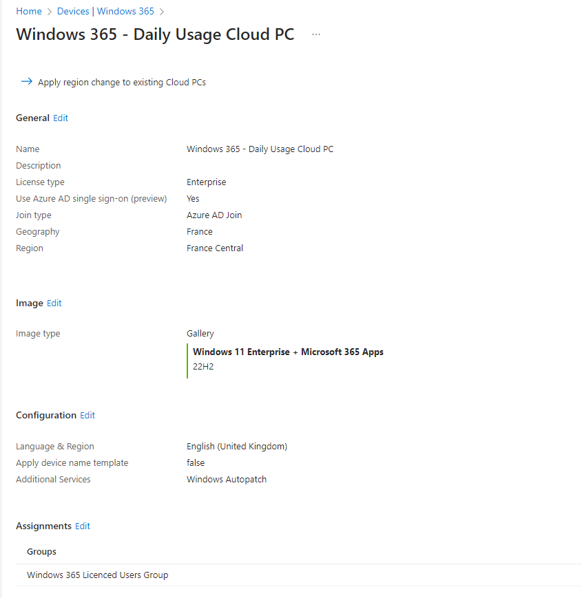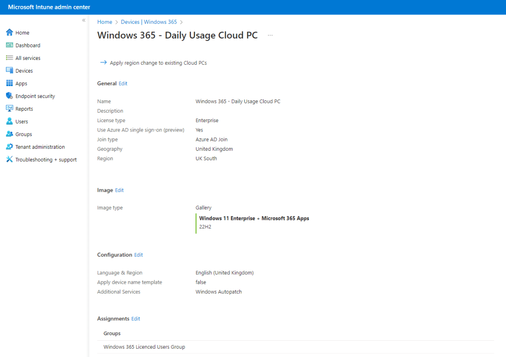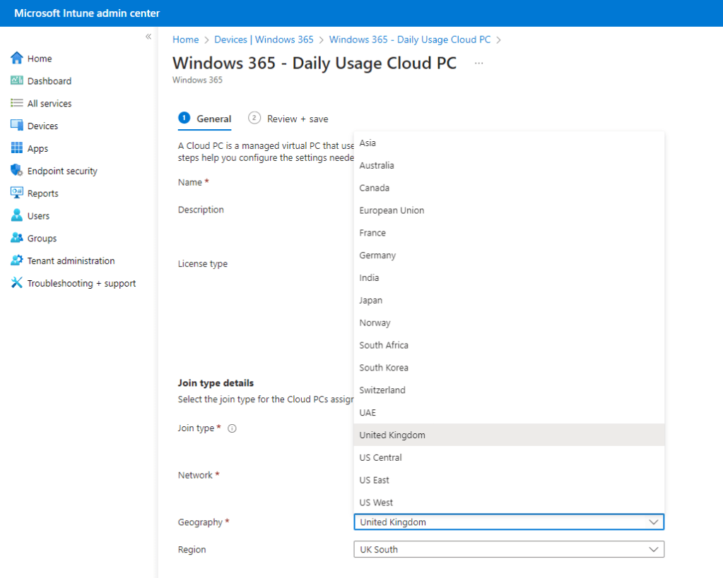 For my demo, I am moving an Azure AD Join device which is on the Microsoft hosted network, therefore I have to change the Geography and Region. Currently my devices are in United Kingdom in the UK South region.