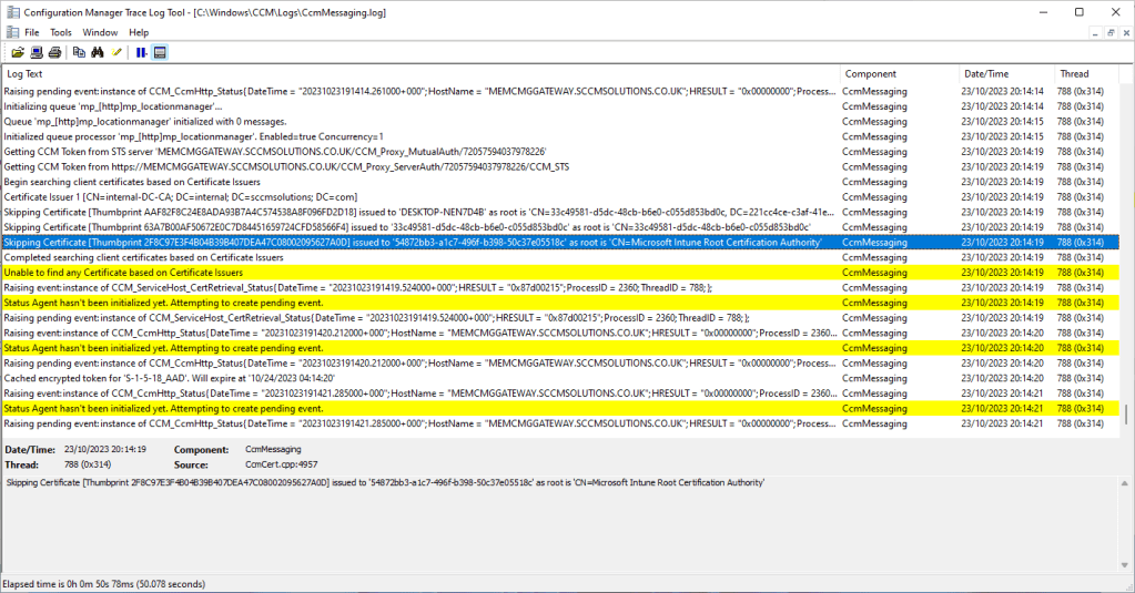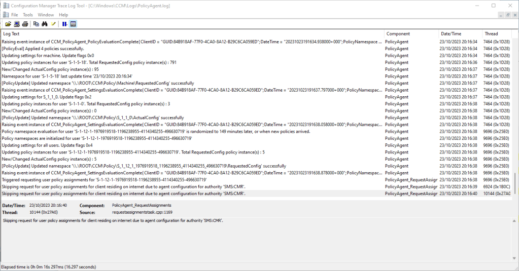 When installing the client via the CMG and the ccmsetup has completed, we can see that the client is allowed to talk to the CMG. All clients are initially allowed to communicate with the CMG, it is just policy which then dictates whether further comms can continue, as we will see. We can see the device is chatting away nicely in the CcmMessaging.log.