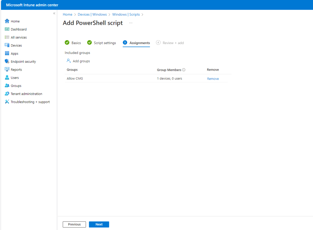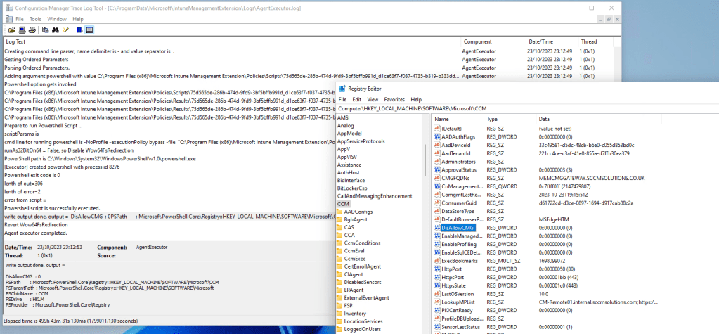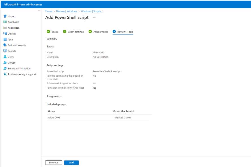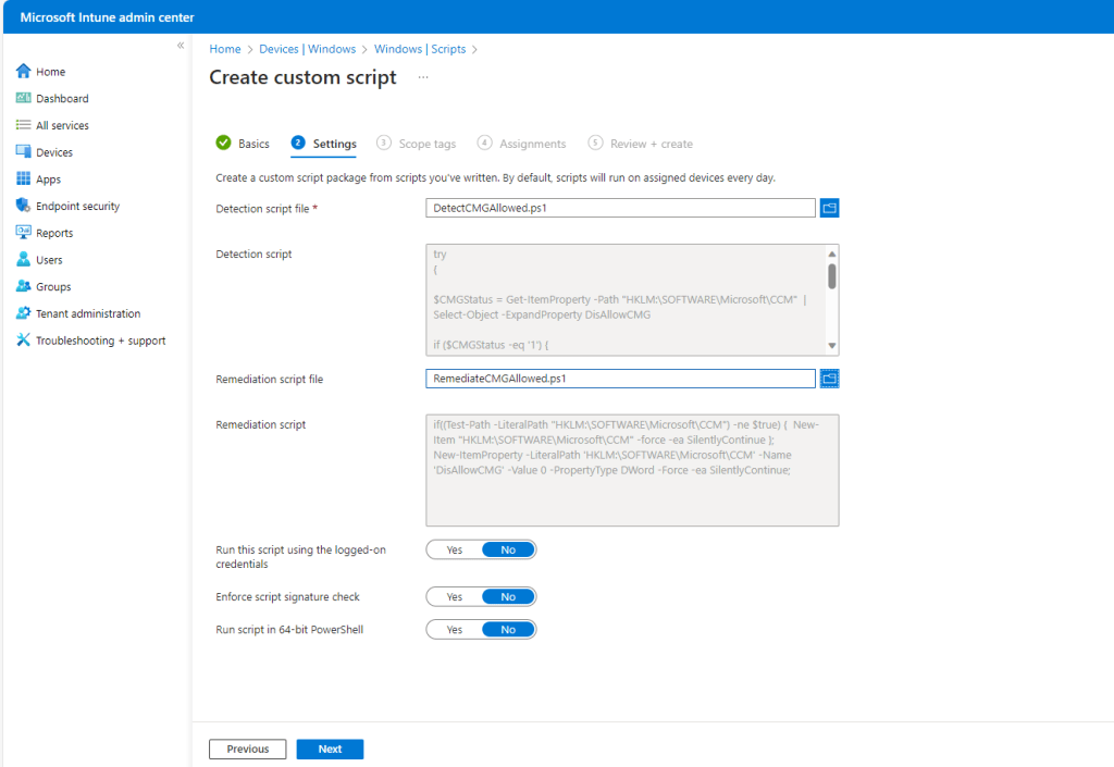 We can deploy this via Intune and I would recommend setting both a PowerShell script and a Remediation. There’s some debate as to whether Remediations apply during the Autopilot process – check Rudy Ooms blog on this. They do, but there can be a delay. So for a new device, built via Autopilot and using the co-management settings profile, we want the setting to hit as soon as possible to keep the flow to the CMG going. Our PowerShell script should fit the bill there. Once a device is up and running we then need to get it into a collection which is targeted for a custom client setting which allows the CMG. Our Remediation is there as a belt and braces, just in case our device is not in the ConfigMgr collection, runs a policy retrieval, gets the policy from the CMG which says it is not allowed to use it and sets the reg key back to 1.