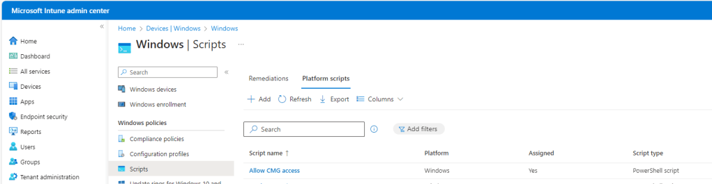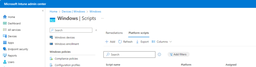 In the Intune admin center go to Devices\Windows\Scripts and click Platform scripts and then click Add.