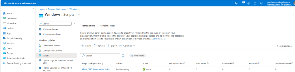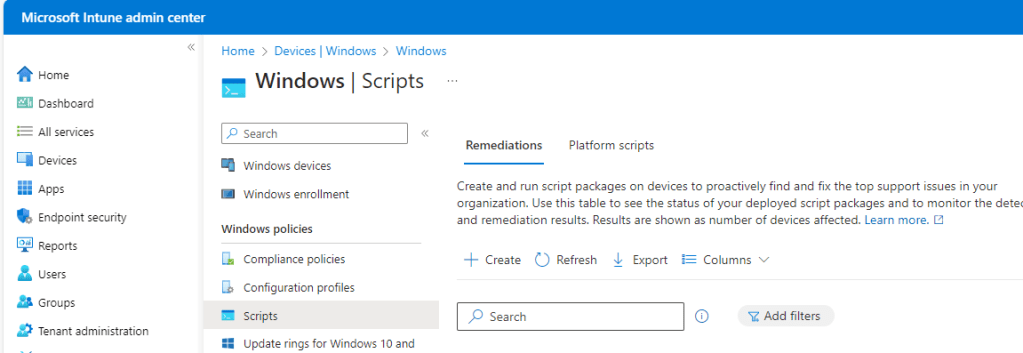 To add the Remediation, in the Intune admin center go to Devices\Windows\Scripts\Remediations and then click Create.