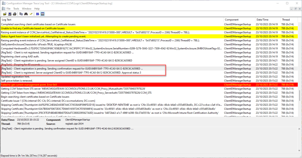 We get to the point of the the client registering with the site, which can be checked in the ClientIDManagerStartup.log file, and the client registers successfully.