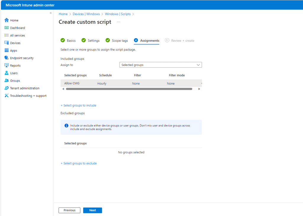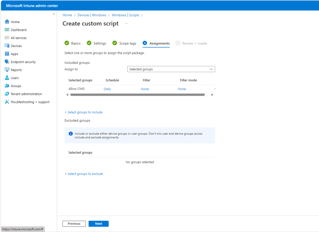 Enter any Scope tags and click Next, then select the groups under Assignments. Note now we need to set a Schedule for the Remediation. The default is Daily.