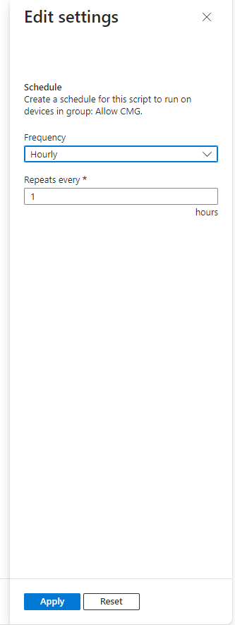 Click the Daily link and change the Frequency to Hourly, Repeats every 1 hour. Click Apply.