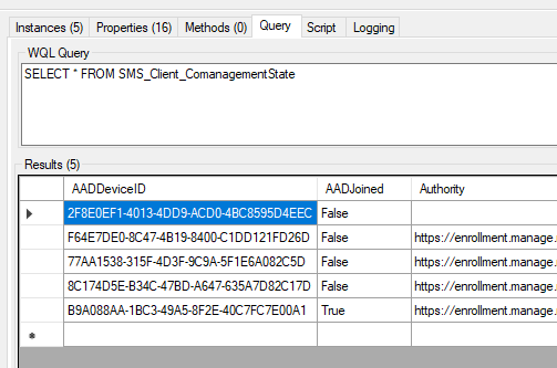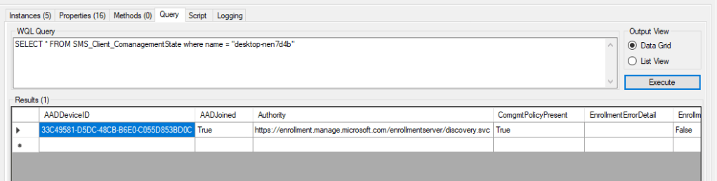 Shortly after, we can re-run our WMI query and the device is now showing up and reporting it is AAD joined.
