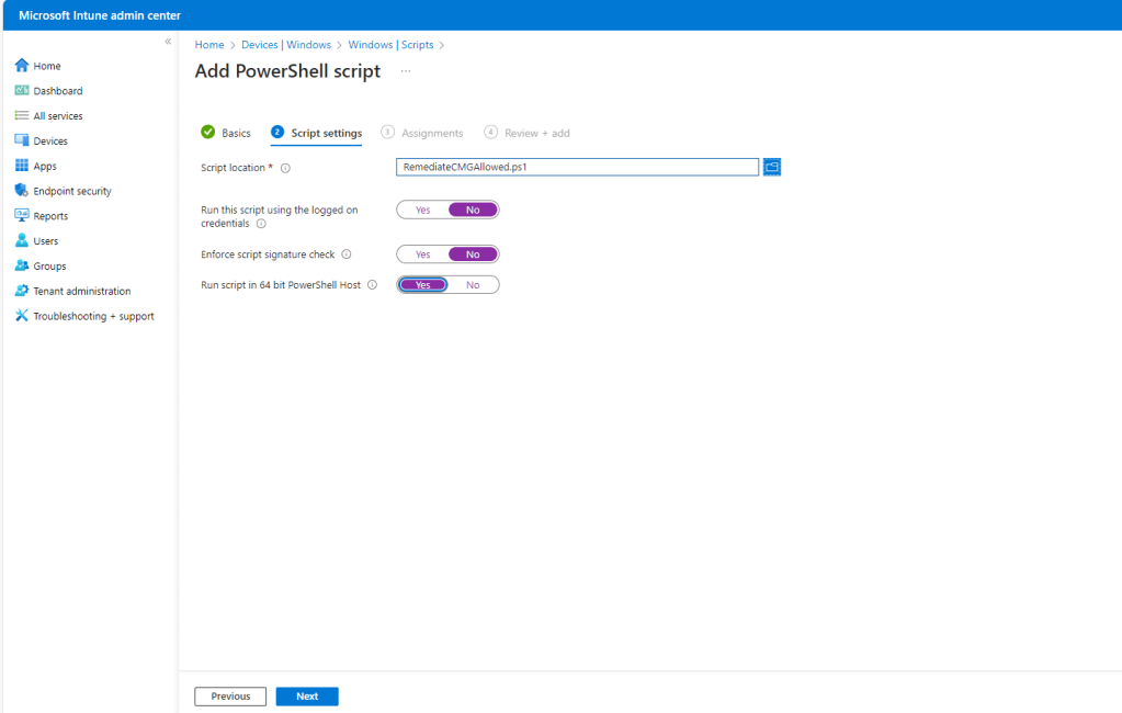 Select the Detection script file and the Remediation Script file. Note the defaults settings are set to No for all settings here, however we need to set Run script in 64-bit PowerShell to Yes. Click Next.