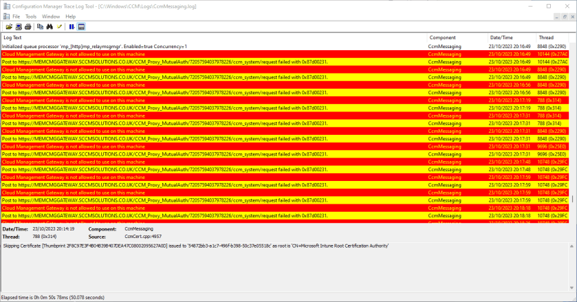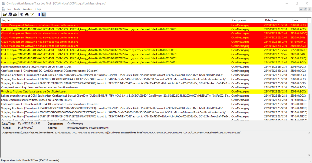 However at this point, the client will have received policy that is is not allowed to use the CMG and therefore will be blocked. If we hop back to the CcmMessaging.log we are instantly presented with a sea of red and told that Cloud Management Gateway is not allowed to use on this machine and Post to the <CMG> request failed with 0x87d00231.