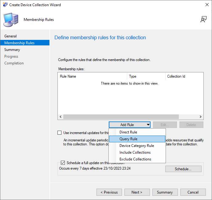 The next step is to create our query collection. We want the device to hit this collection as quickly as possible so we will limit to All Systems and set it to Incremental.