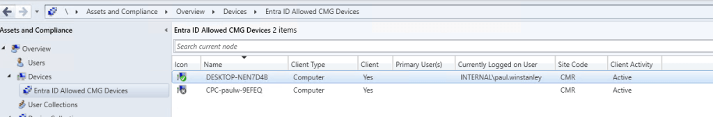 The device does exist in ConfigMgr, as it has registered and the information associated with it is what you would expect from a MP client registration but there is zero time for a device to get populated into another ConfigMgr collection and have an ‘allow CMG’ client setting to be targeted at it.