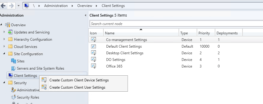 Finally we must target the client setting to the collection. Navigate to \Administration\Overview\Client Settings and right-click and select Create Custom Client Device Settings.