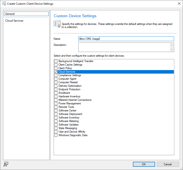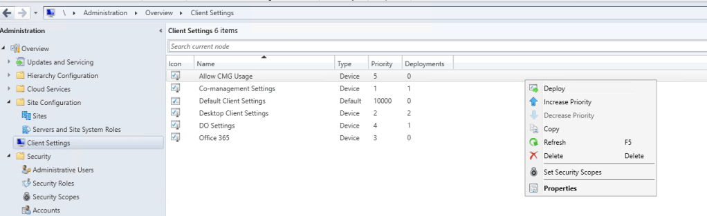 Some admins don’t like to modify the default client settings and we tend to advice against this and to copy the default off into a custom settings policy. Also when testing the CMG, admins also like to be granular, rather than applying a change across all devices in the environment. A prudent decision.