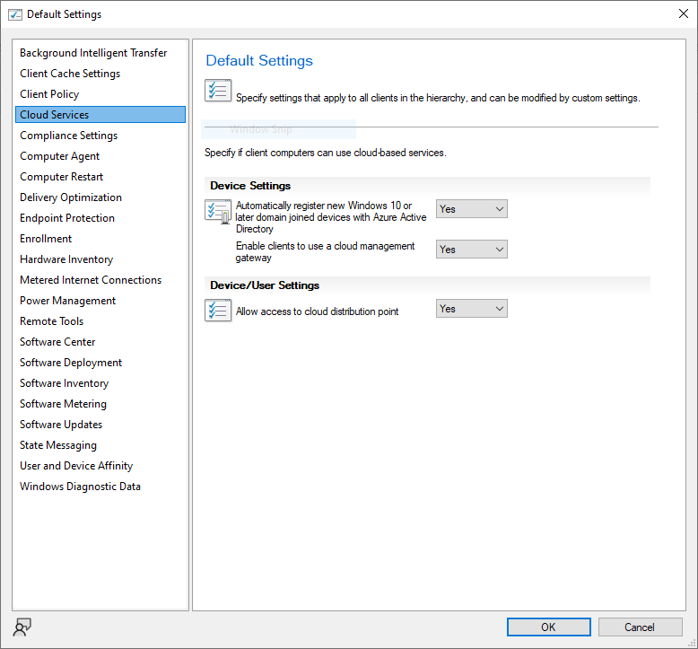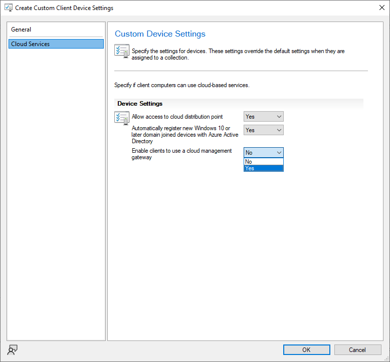Click the Enable clients to use a cloud management gateway drop down and select Yes and, if you’re allowing access to the CDP, do the same for the Allow access to cloud distribution point drop down. Click OK.