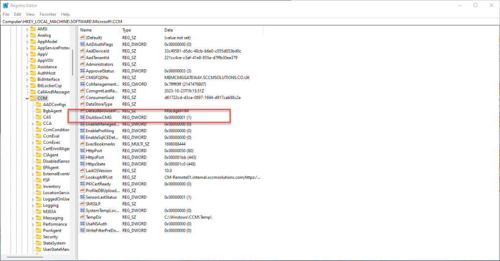 So how can we get around the problem without enabling the Enable clients to use a cloud management gateway setting on the Default Client Setting? Quite simple, we can use a registry key which the client setting is enabling. This is the DisAllowCMG key located at Computer\HKEY_LOCAL_MACHINE\SOFTWARE\Microsoft\CCM.