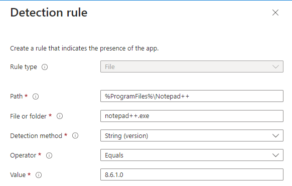 I created an Enterprise App Catalog app for Notepad++, which is currently set as version 8.6.1. The Detection rule state that the install is valid for any targeted device which not running 8.6.1.