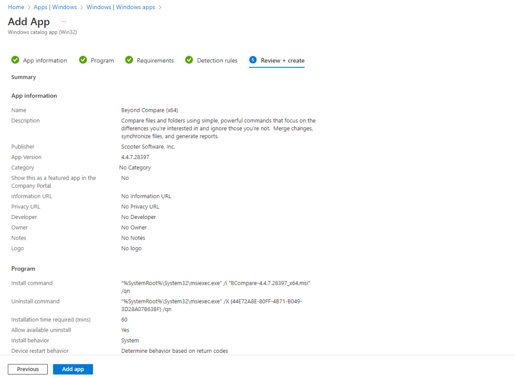Moreover, Intune automatically prefills detection rules that devices must meet before the app is installed, such as file size, file version, and registry settings. Additionally, it fills in the requirements that devices must meet before installation, including the Windows OS architecture required and the minimum OS version. These pre-filled details streamline the deployment process and eliminate the guesswork, allowing for smoother and more reliable app installations.