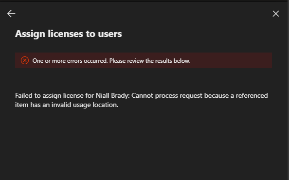 In our tenant, we received the following error message ‘Failed to assign license for Niall Brady: Cannot process request because a referenced item has an invalid usage location.’ You may not receive this error and not have to perform the fix.
