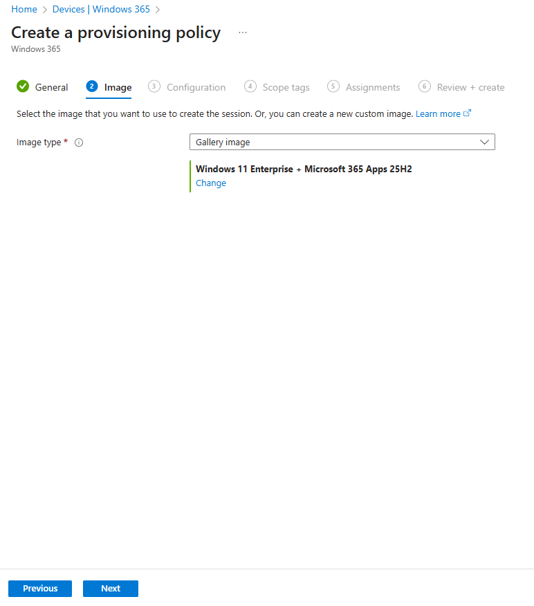 We selected the Windows 11 Enterprise + Microsoft 365 Apps 25H2 gallery image to ensure that we met the O/S requirements.