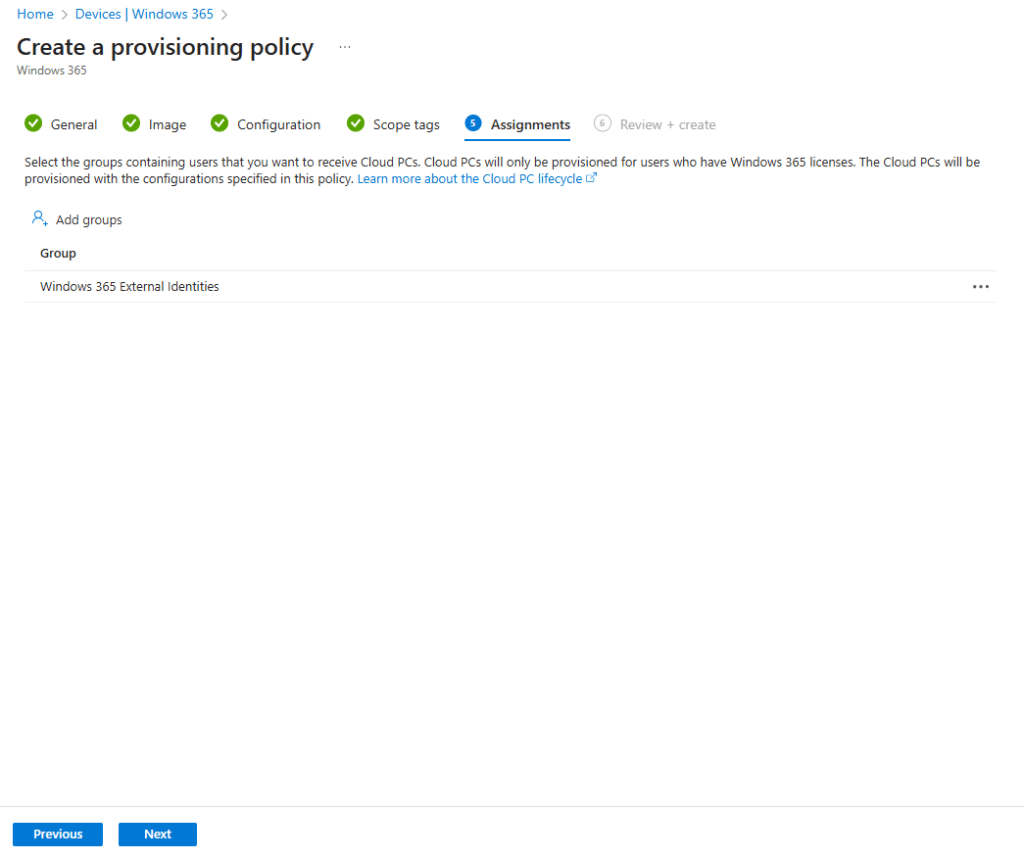 When assigning the policy, we targeted a group called Windows 365 External Identities.