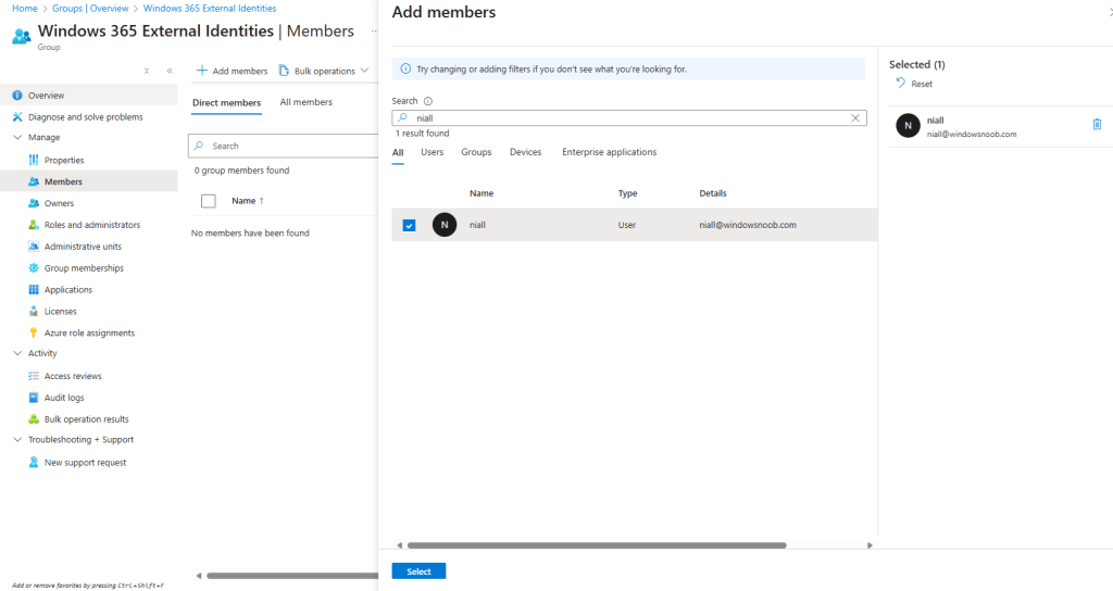 Next, we simply added Niall’s guest account to the Windows 365 External Identities group. We navigated to Groups and searched for the group and added his account.