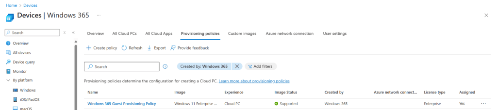 We decided to create a new provisioning policy using the new 25H2 release of Windows 11. We navigated to Devices | Device onboarding | Windows 365 | Provisioning policies in our tenant and clicked Create policy.